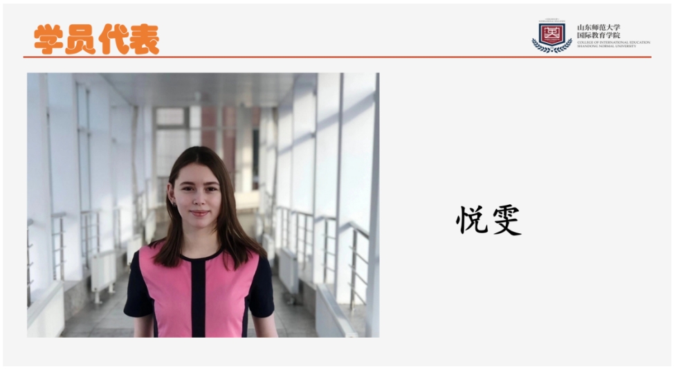 俄罗斯北方联邦大学翻译与应用语言教研室德鲁日尼娜·玛丽亚·维亚切斯拉沃夫娜也是冬令营学员,全程参加了学习,她说:“我非常喜欢此次冬令营项目的教学设计,以及宣传海报。老师们设计的PPT非常精美,我想去这样的地方旅游。”她还用汉语表达了对琵琶、音乐、山水画的喜爱,并用:“你好,我爱中文”结束了讲话。