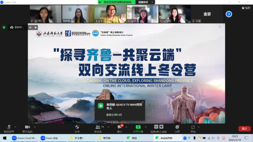 北京时间2023年3月19日下午六点,由教育部中外语言交流合作中心主办、山东师范大学承办的“汉语桥”线上团组交流项目——“探寻齐鲁-共聚云端”双向交流线上国际冬令营顺利结营。山东师范大学国际教育学院留学生教育系主任常庆丰、项目负责人刘一帆、项目授课教师以及来自俄罗斯、越南、泰国等国家的百余位营员相聚云端,一同见证了冬令营的收官仪式。