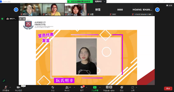 “探寻齐鲁-共聚云端”双向交流线上冬令营结营仪式由胡惠怡主持,首先中方领导常庆丰教授为结营仪式致辞,常庆丰教授对本次冬令营活动的圆满结束表示了祝贺,并诚邀各位营员赴中国亲身体验齐鲁文化。随后,诸位授课教师一一向营员们送上寄语,并表示在本次冬令营活动中与营员们共度了愉快的交流学习时光。