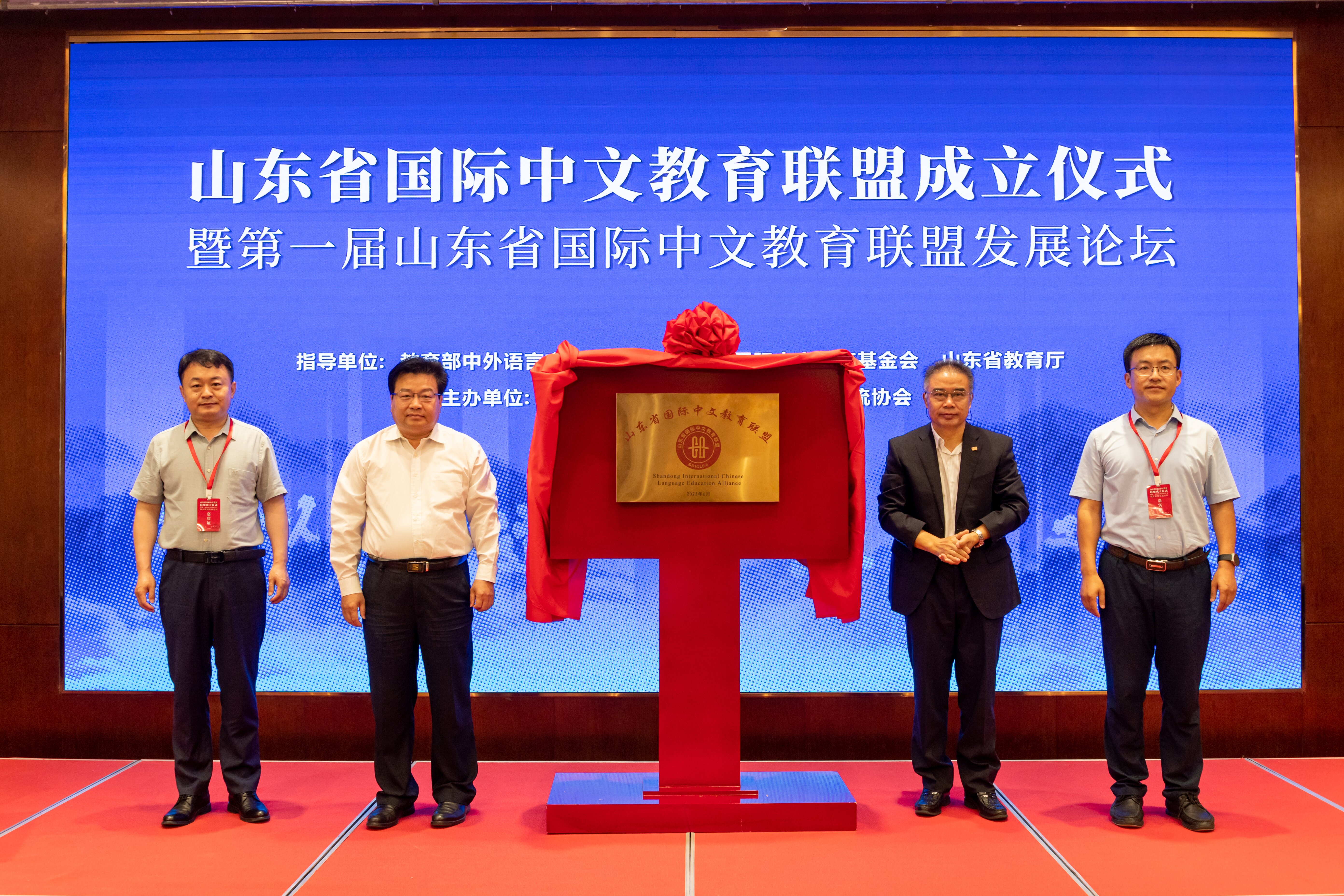 随后,赵灵山、孙祖兴、王甬、郑元杰共同为“山东省国际中文教育联盟”揭牌。山东省国际中文教育联盟正式成立。