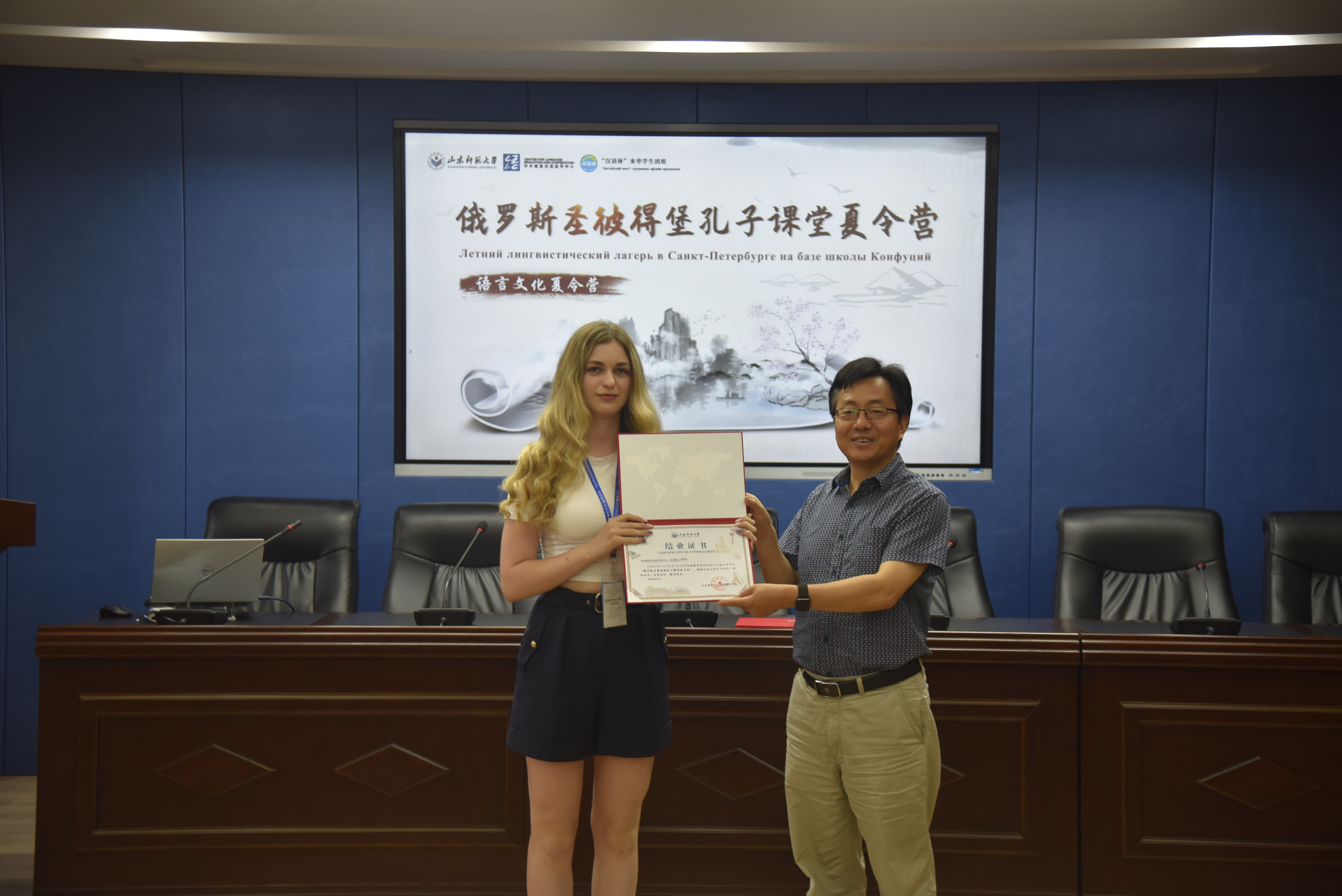 在欢乐的氛围中,结营仪式也走向了最后一项。山东师范大学国际教育学院院长马茂祥,为全体夏令营营员颁发结营证书,并分别合影留念。