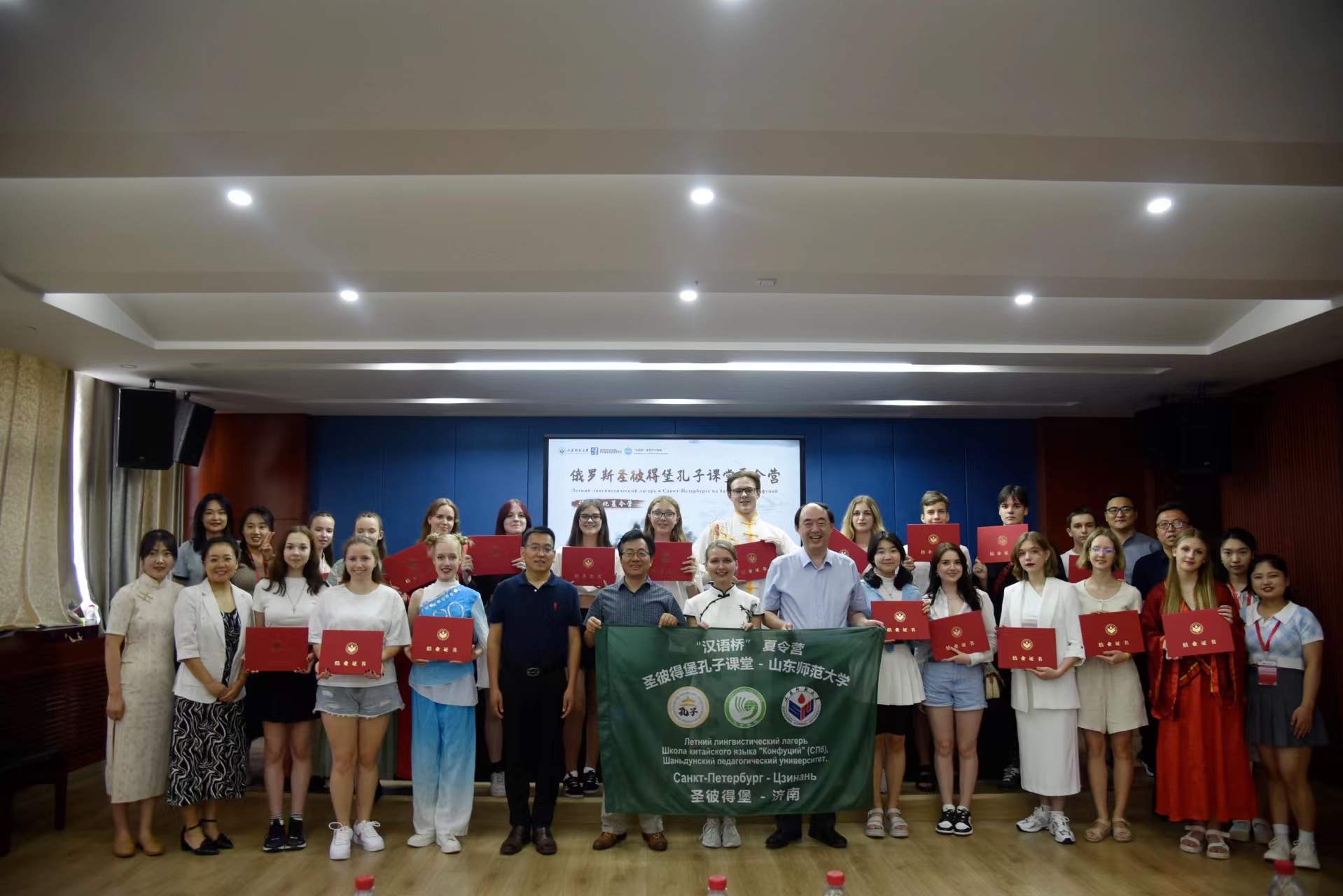 北京时间2023年7月14日下午,由教育部中外语言交流合作中心主办,山东师范大学承办的2023年“汉语桥”来华团组交流项目——俄罗斯圣彼得堡“孔子”东方语言文化学院孔子课堂夏令营结营仪式在山东师范大学举行。山东师范大学国际教育学院院长马茂祥、俄罗斯圣彼得堡“孔子”东方语言文化学院孔子课堂中方院长黄克显、山东师范大学留学生教育系主任常庆丰、山东师范大学留学生办公室副主任刘峰、山东师范大学教师代表盛蕾、圣彼得堡东方语言文化学院孔子课堂夏令营领队娜斯佳、夏令营志愿者以及全体营员参加了结营仪式。结营仪式由国际教育学院教师西茹静主持。