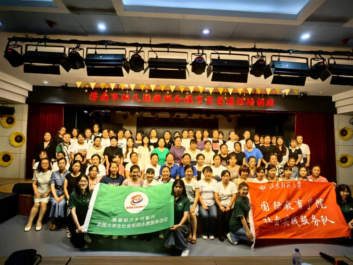 为深入贯彻落实党的二十大精神,推进新时代语言事业的高质量发展,加大国家通用语言文字推广力度,国家语言文字推广基地(山东师范大学)携手国际教育学院“师音济济”社会实践服务队,于7月24日赴济南市五区一县,面向六地农村幼儿园教师及保育员开展了为期5天的国家通用语言文字线下集中培训,并举行了一系列主题活动,有效提升了当地幼儿园教师和保育员的普通话水平和教育教学能力,收获了参训学员和当地教育教学部门的一致好评。