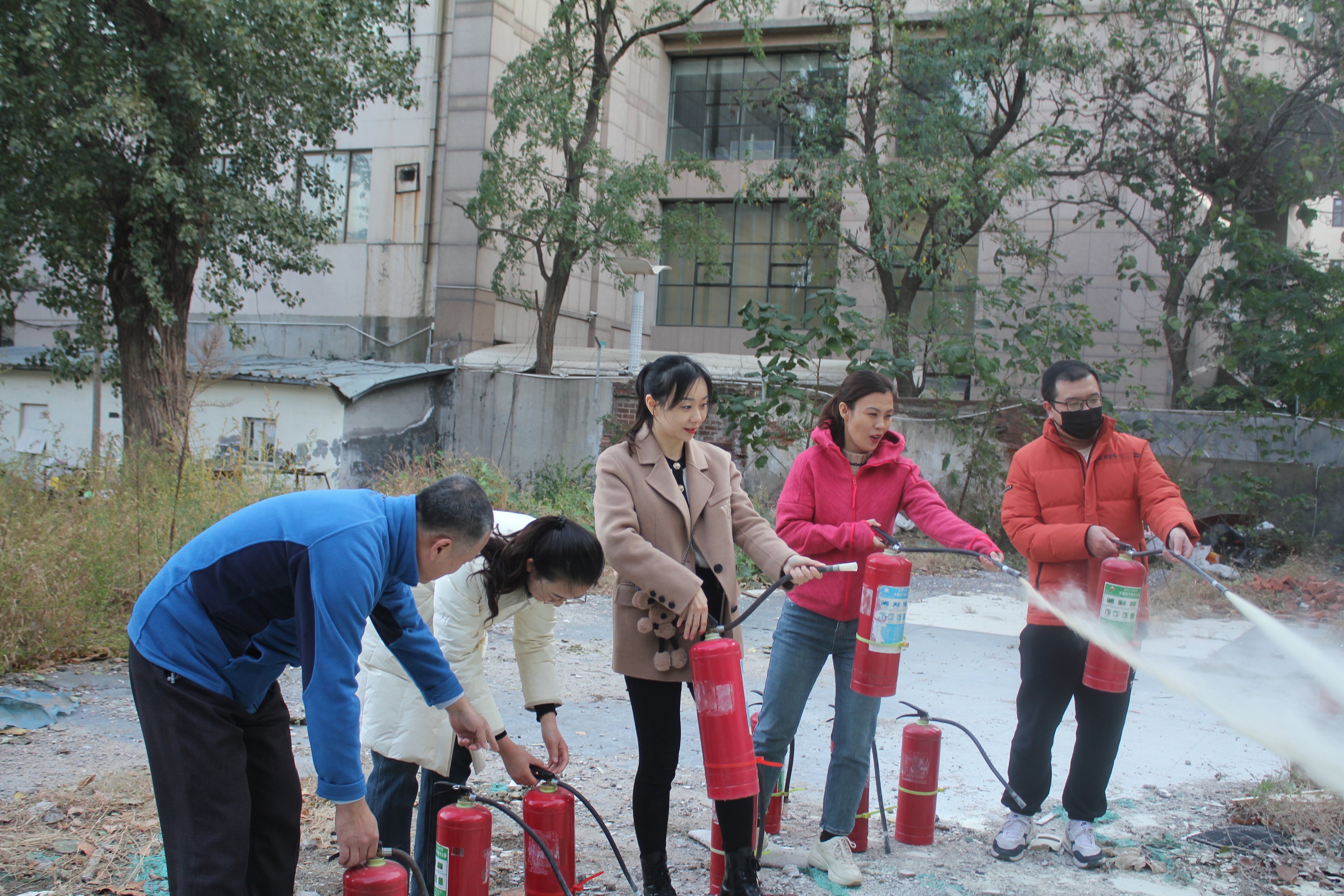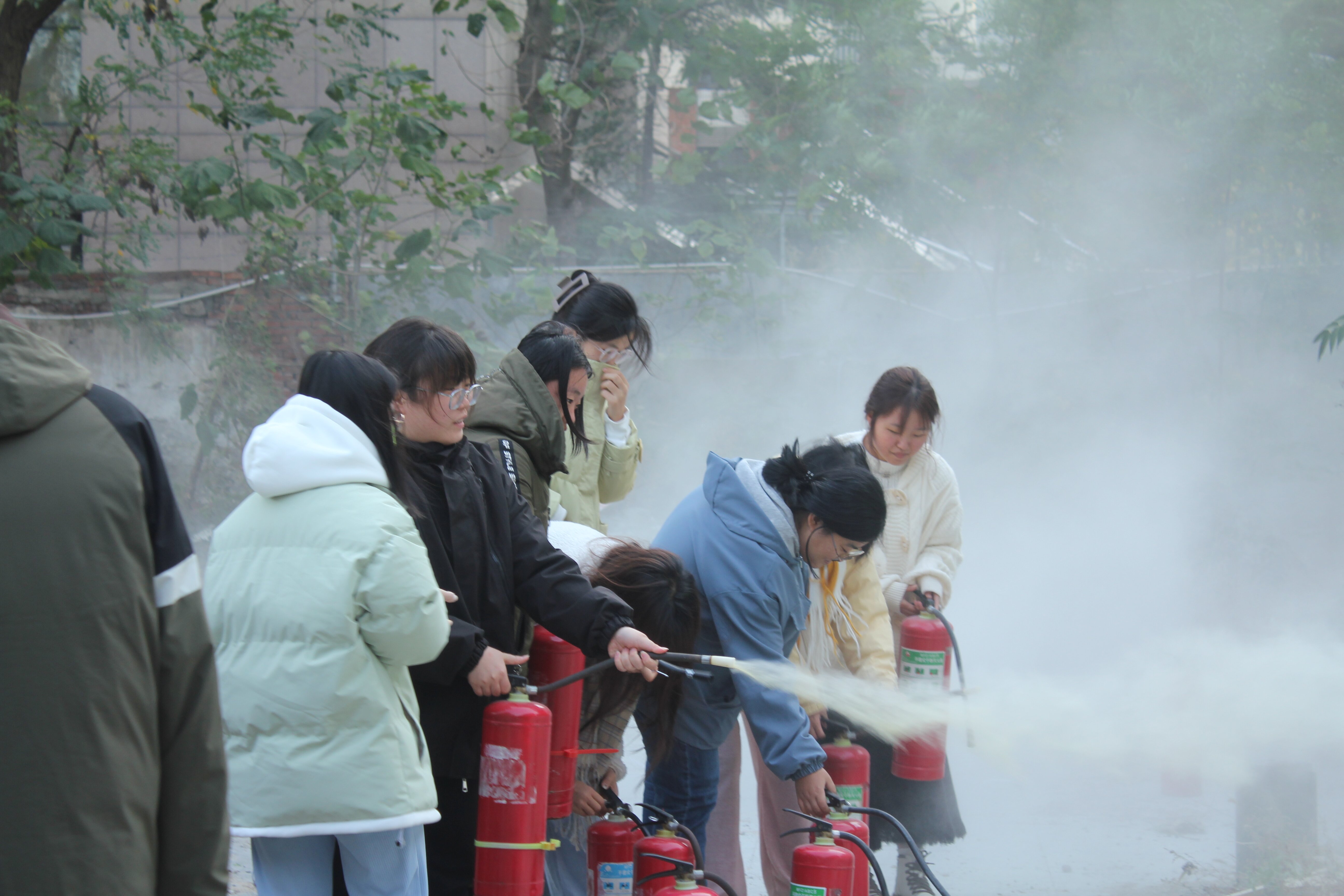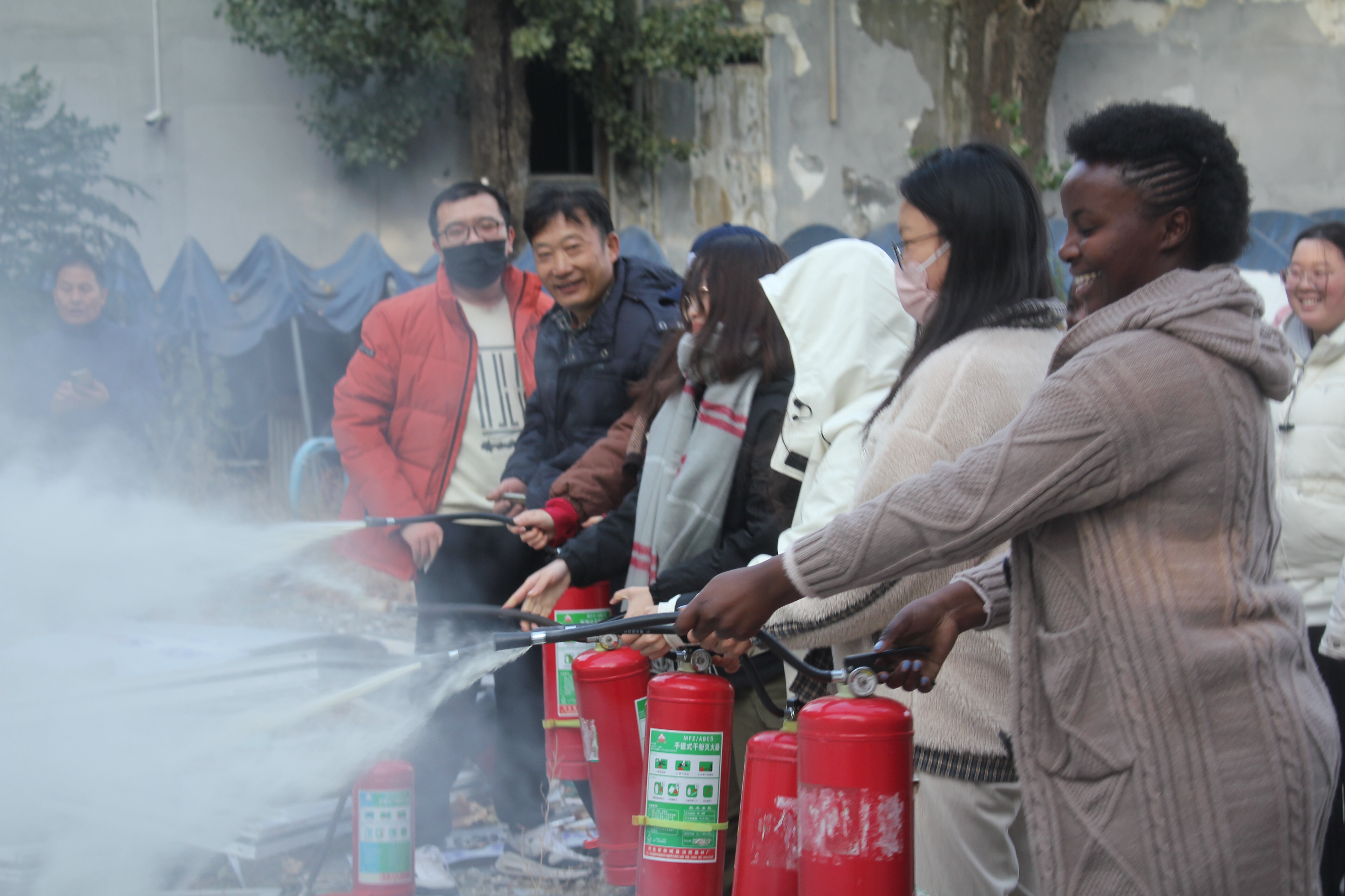 灭火实战演练环节,留学生与23级本科生一同前往操场西南角学习如何使用灭火器。杨科长为全体学生讲解了灭火器的正确使用步骤,并强调使用时的注意事项,演示结束后指导在场师生上前实操。学生分组依次进行练习,切实掌握了灭火器的使用方法,有效提升了自身保护能力。本次消防演练活动圆满结束。