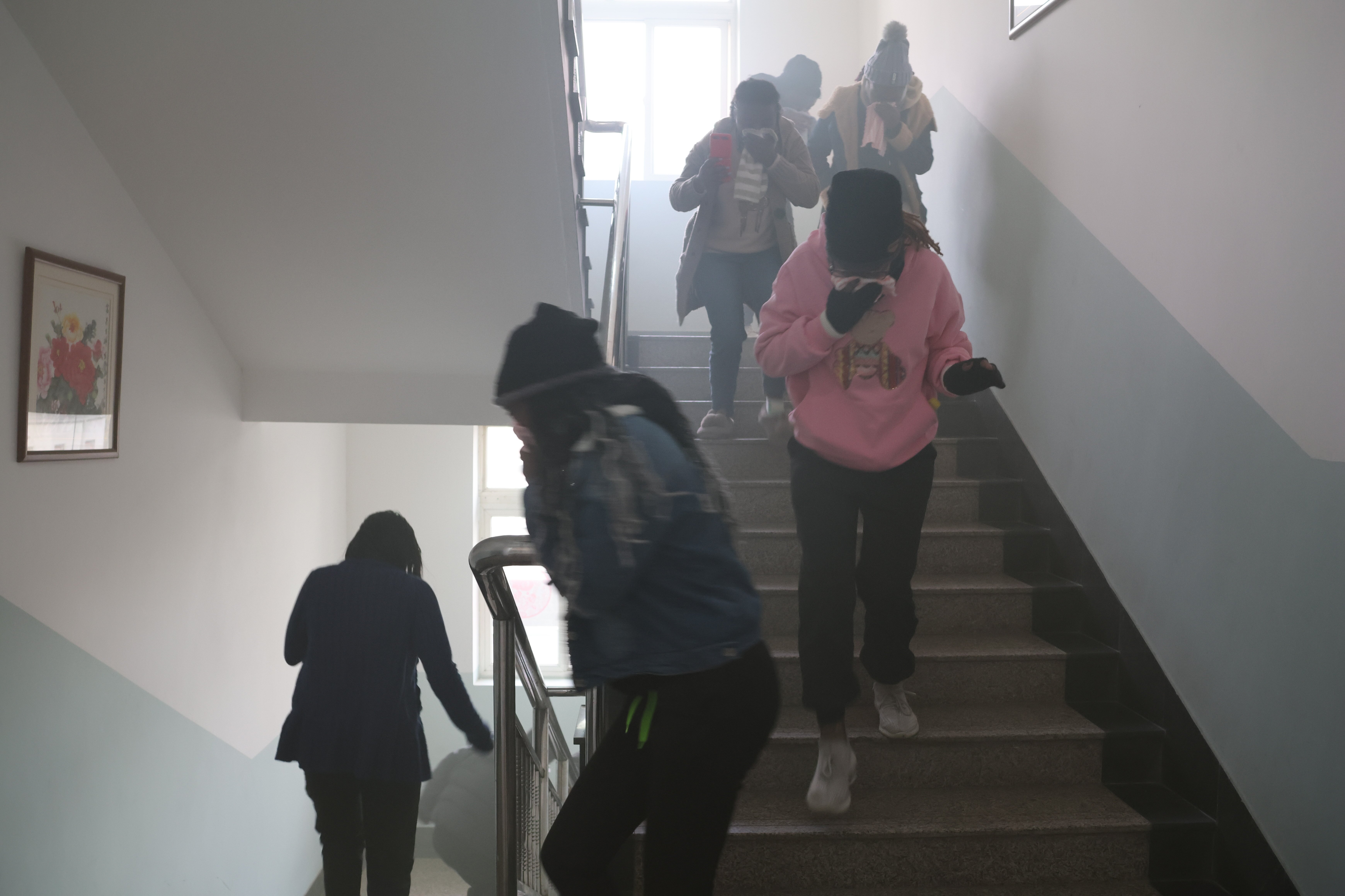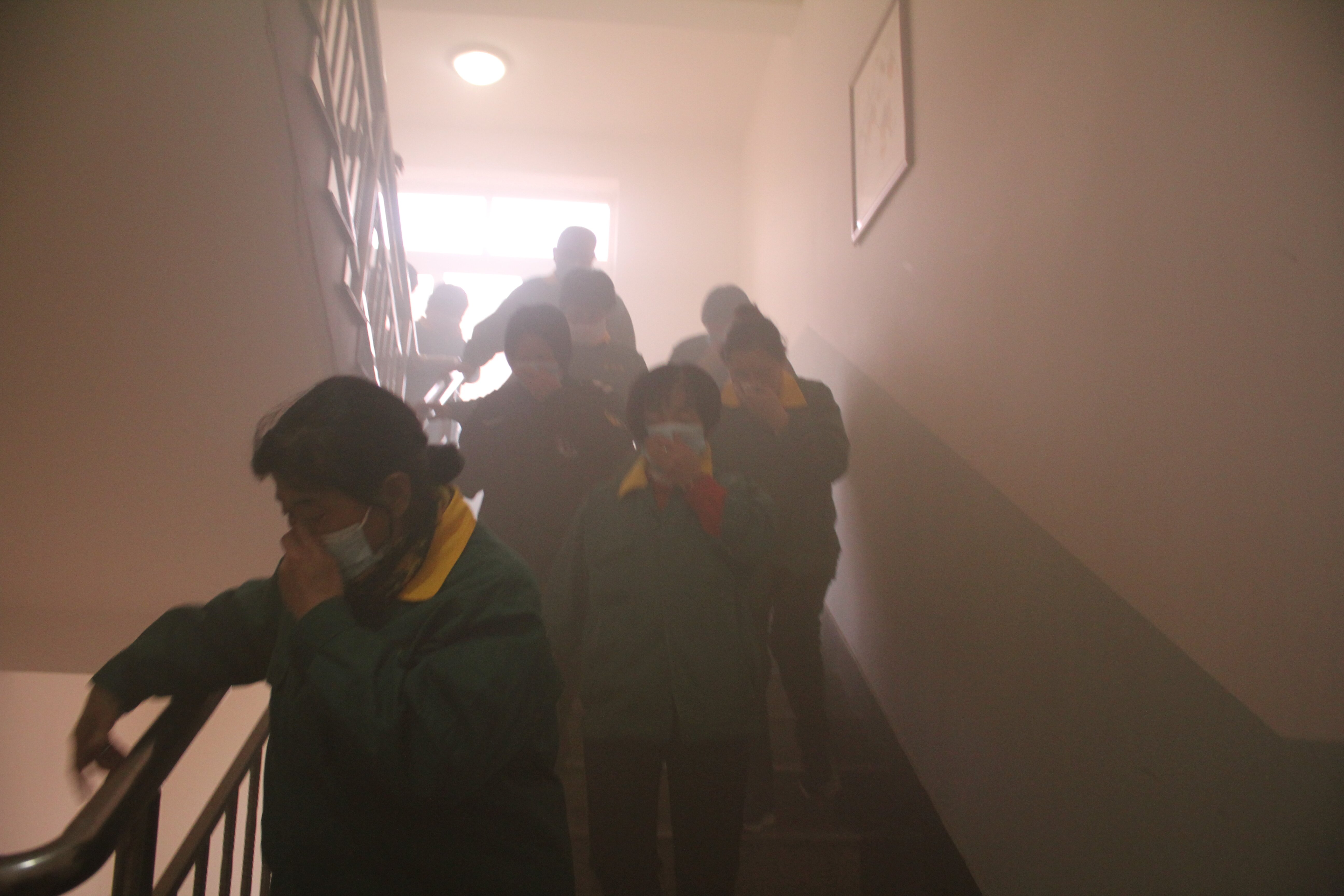 室内应急疏散演练环节,杨科长为学院部分教工,公寓楼全体工作人员及留学生详细讲解了消防安全知识。他指出,在面对宿舍突发火灾时应沉着冷静,并提出了“用湿毛巾捂住口鼻,弯腰前进”等具体逃生技能。大家认真学习安全知识,在演练过程中按照疏散要求,俯身迅速穿过“浓烟”,井然有序地从宿舍楼内撤离到室外“安全”地带。