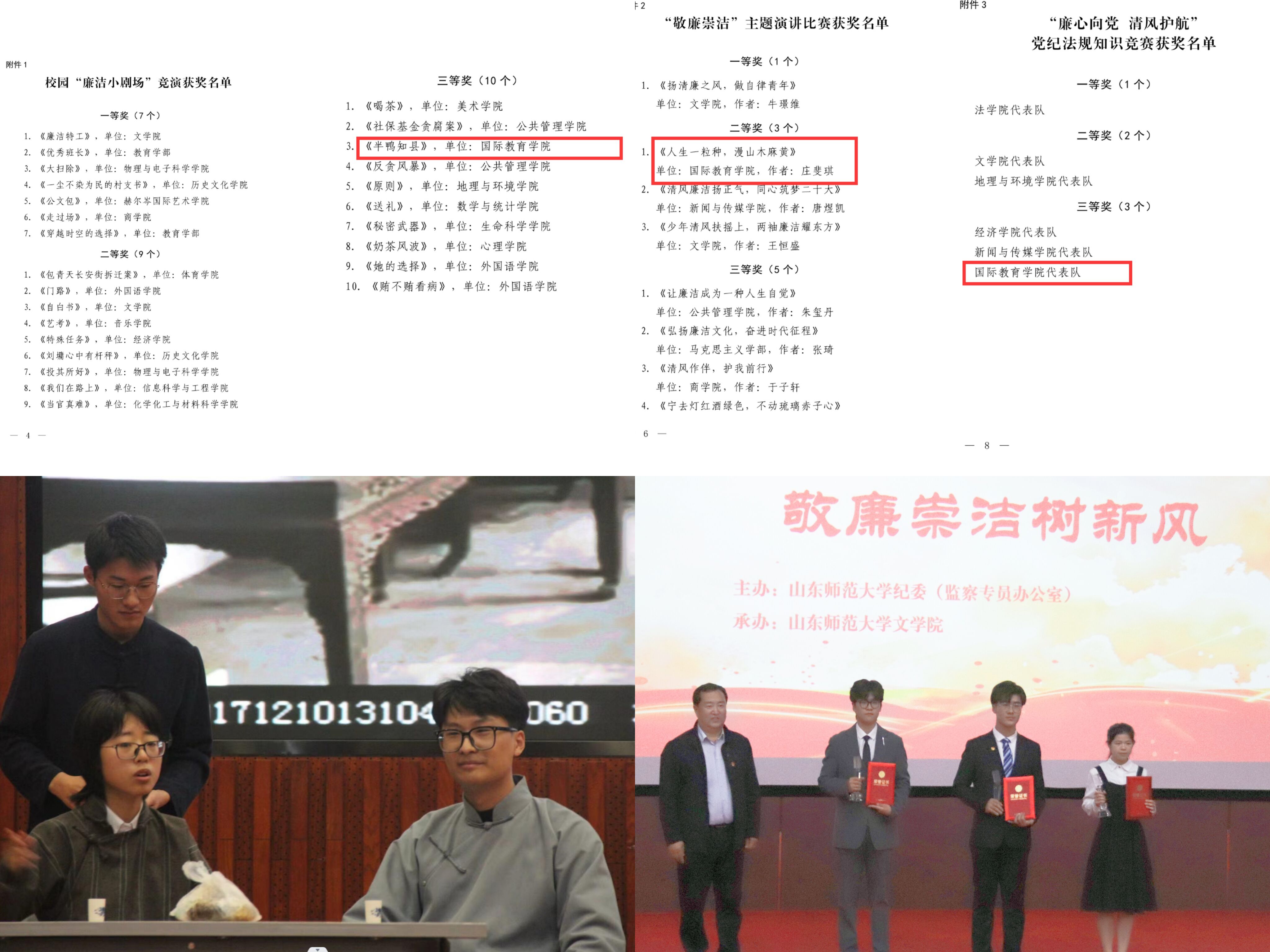 文以化人,廉以养德。国际教育学院党委积极响应学校纪委号召,鼓励学生积极参与由学校纪委主办的“校园廉洁文化活动”,取得佳绩。在校园“廉洁小剧场”竞演活动中,学院的参演剧目《半鸭知县》获三等奖;在第四届“敬廉崇洁”演讲比赛中,经过激烈角逐,学院参赛代表获得全场第二名的优异成绩;在“廉心向党,清风护航”党规法纪知识竞赛中,国际教育学院代表队获得三等奖。学院学子还积极参与“润心话语”视频征集大赛、“敬廉崇洁”主题书法比赛以及“廉心文语”校园征文大赛,表现优异,成绩突出,获得一、二、三等奖,国际教育学院荣获优秀组织奖。暑假期间,学院党委组织学生参加“寻找良好家风家训”主题社会实践活动,在全体同学中厚植“爱党爱国爱家”的家国情怀,进一步弘扬清风正气,传承优良家风家训,十余人获校级三等奖、优秀奖等荣誉奖项。