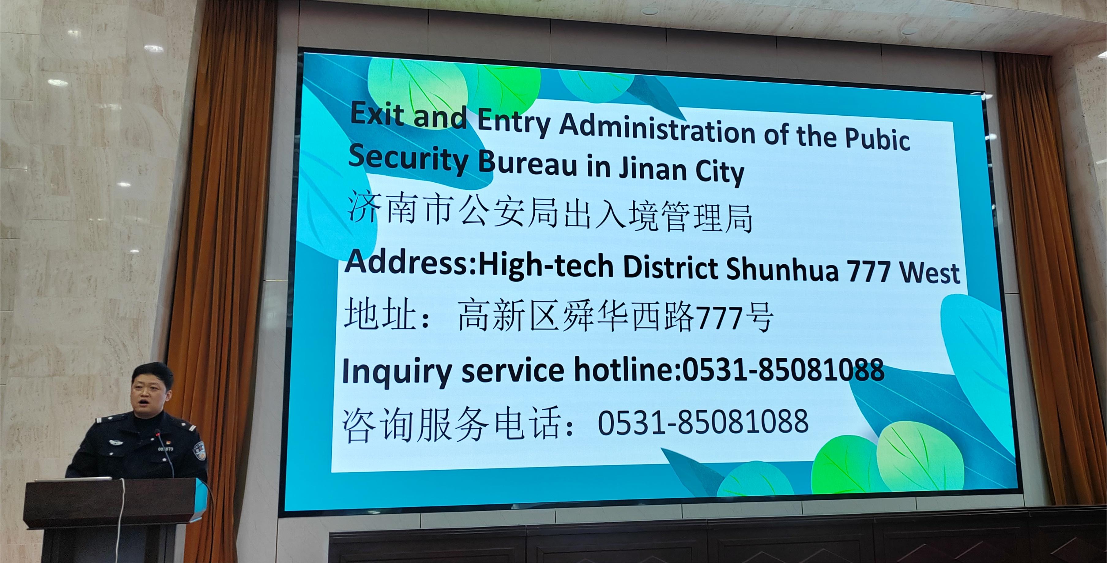 济南市出入境管理局外国人管理科于洋警官与全体国际学生分享了《外国人在济南生活指南》,就涉外法律法规、签证及居留许可办理、日常安全等内容进行宣讲。