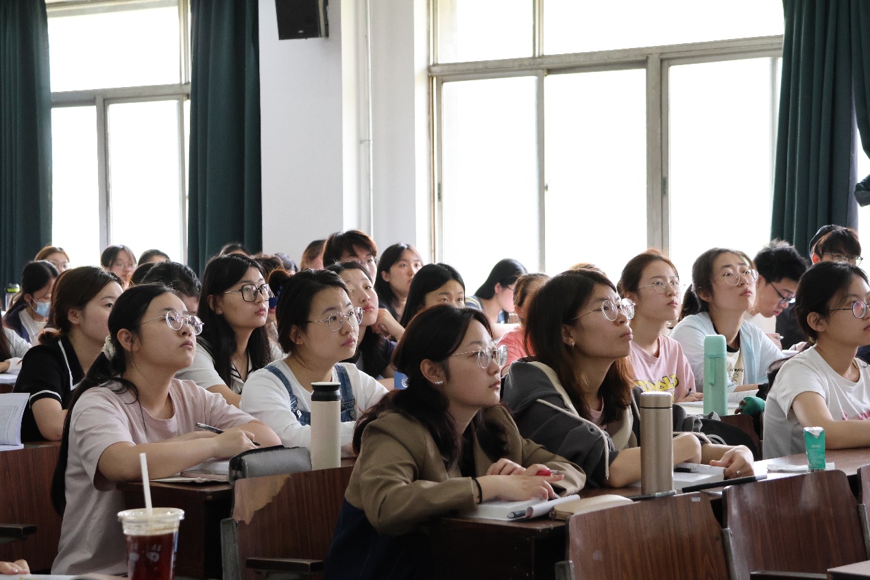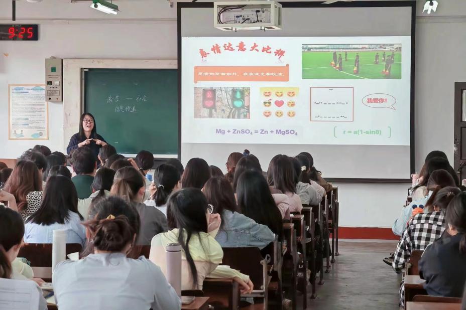 第二场教学观摩活动由徐晶晶老师主讲。徐老师所讲授的课程是《语言学概论》。她以有趣的动画猜谜视频入手,导入了本节课的关键内容——语言,并通过丰富的举例和形象的比喻阐述了“社会”“语言”“言语”等相关概念,进而结合生动的PPT展示和清晰的板书设计,讲解了语言的信息传递功能、人际互动功能、社会构建和社会认知功能等具体内容。在此基础上,徐晶晶老师由浅入深,层层递进地引导学生思考、与学生互动交流,情理并重,学理交融,使学生们在学习专业知识的同时也拓展了创新思维。
