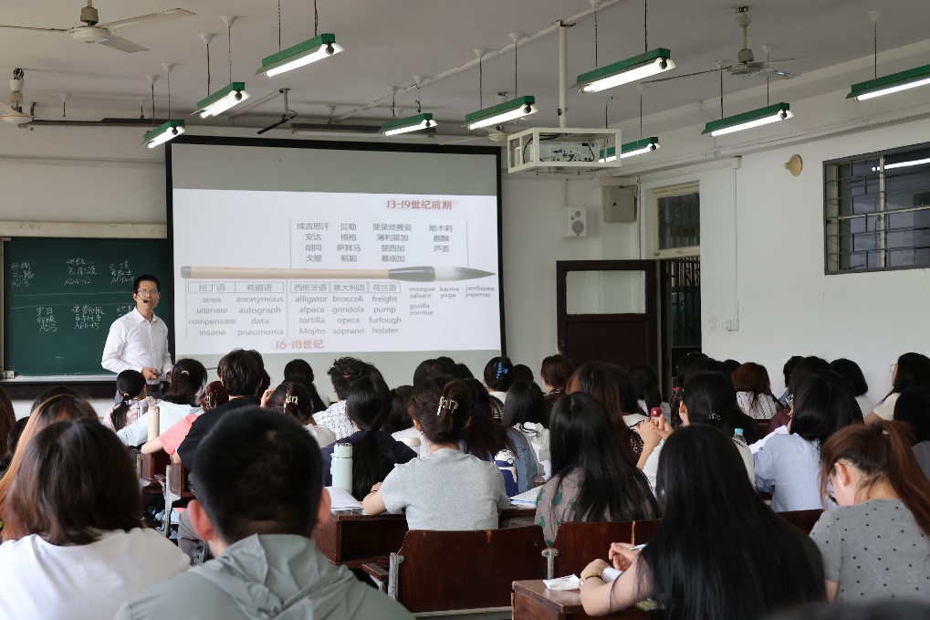 第一场教学观摩活动由骆牛牛老师主讲,骆老师讲授的课程是《汉外语言对比》。课堂展示阶段,骆牛牛老师以复习导入,在与学生的互动中引出汉语和英语中的外来词这一主题,按照时间序列,对英语和汉语中的外来词、基于外来词视角的汉英语发展特点等内容展开课程。在讲解过程中,骆老师巧妙地运用生活化的情景、生动贴切的类比将理论知识转化成学生易于接受的观点,其选取的教学材料更是集文学、语言、历史、思政等要素于一体。此次授课充分展现了骆老师优秀的教学能力和深厚的专业素养,受到师生的一致好评。