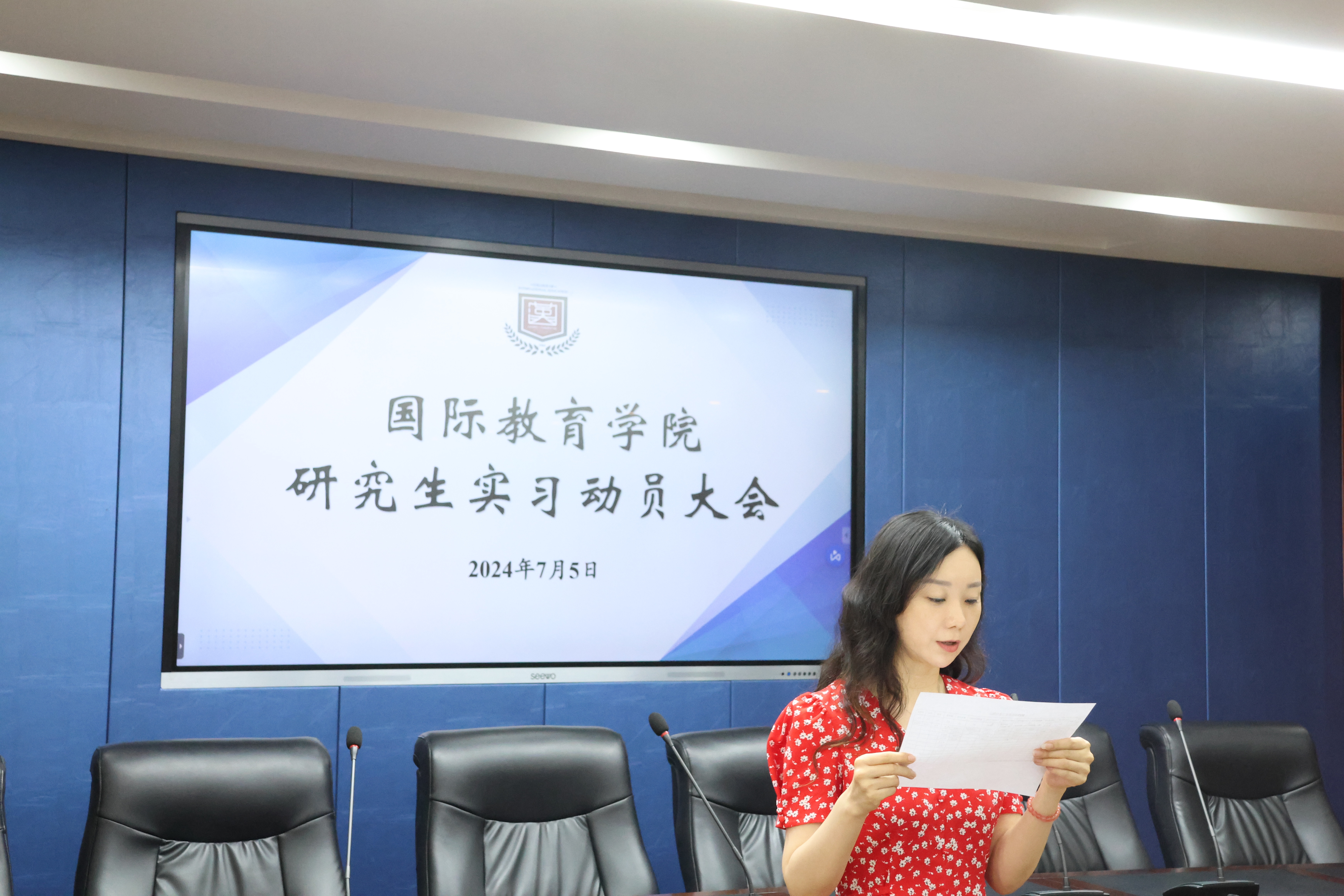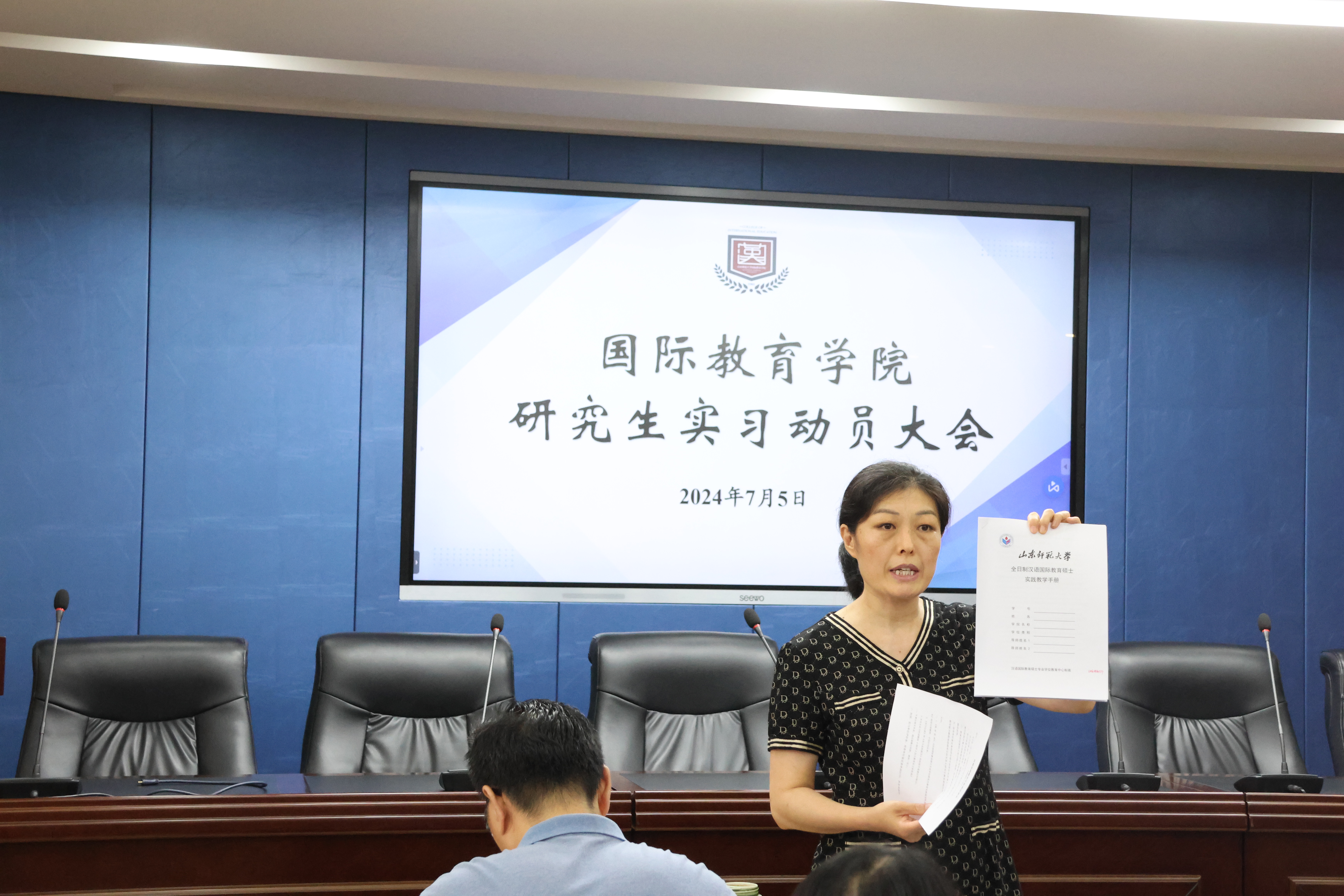 为深入贯彻学院先进教学理念,进一步提升研究生人才培养质量,引导学生树立正确的实习观念,并全面做好实习前的各项准备工作,国际教育学院于7月5日上午在千佛山校区教学三楼3546报告厅召开了研究生实习动员大会。本次大会由团委书记、研究生辅导员刘琪主持,学院党委书记刘金凯、党委副书记徐方杰、副院长王其和、教学秘书张庆艳、部分研究生导师以及全体2023级研究生参加会议。