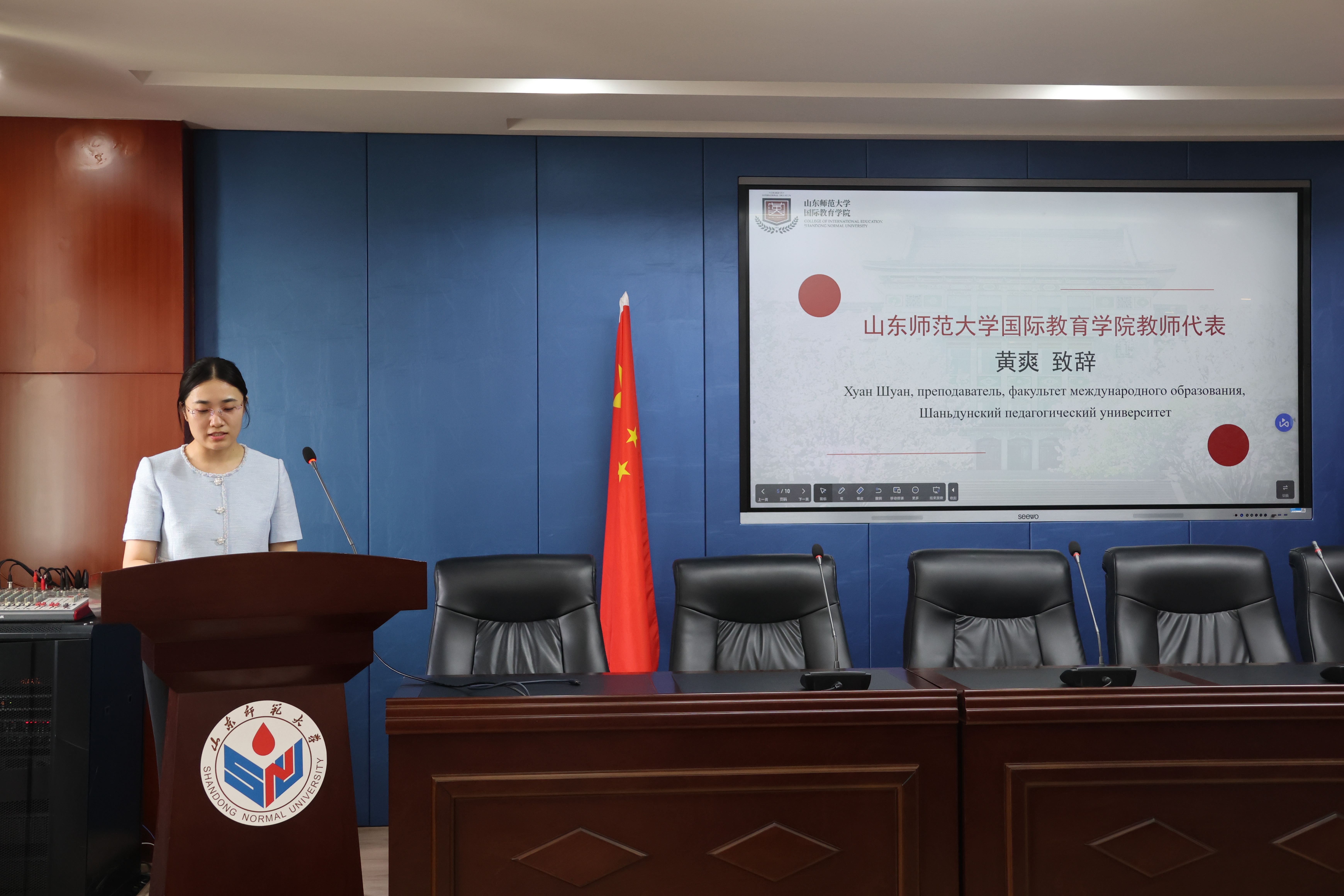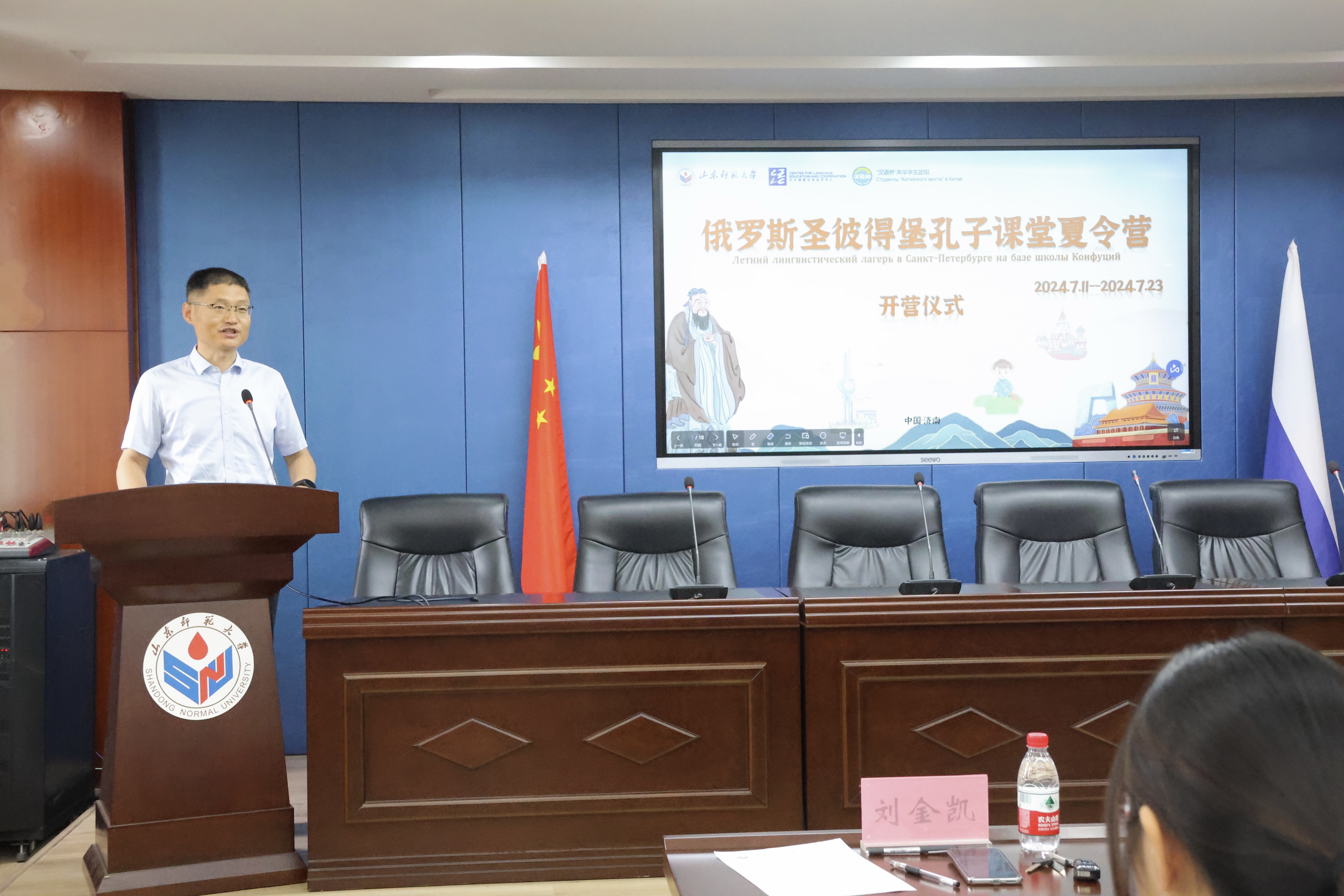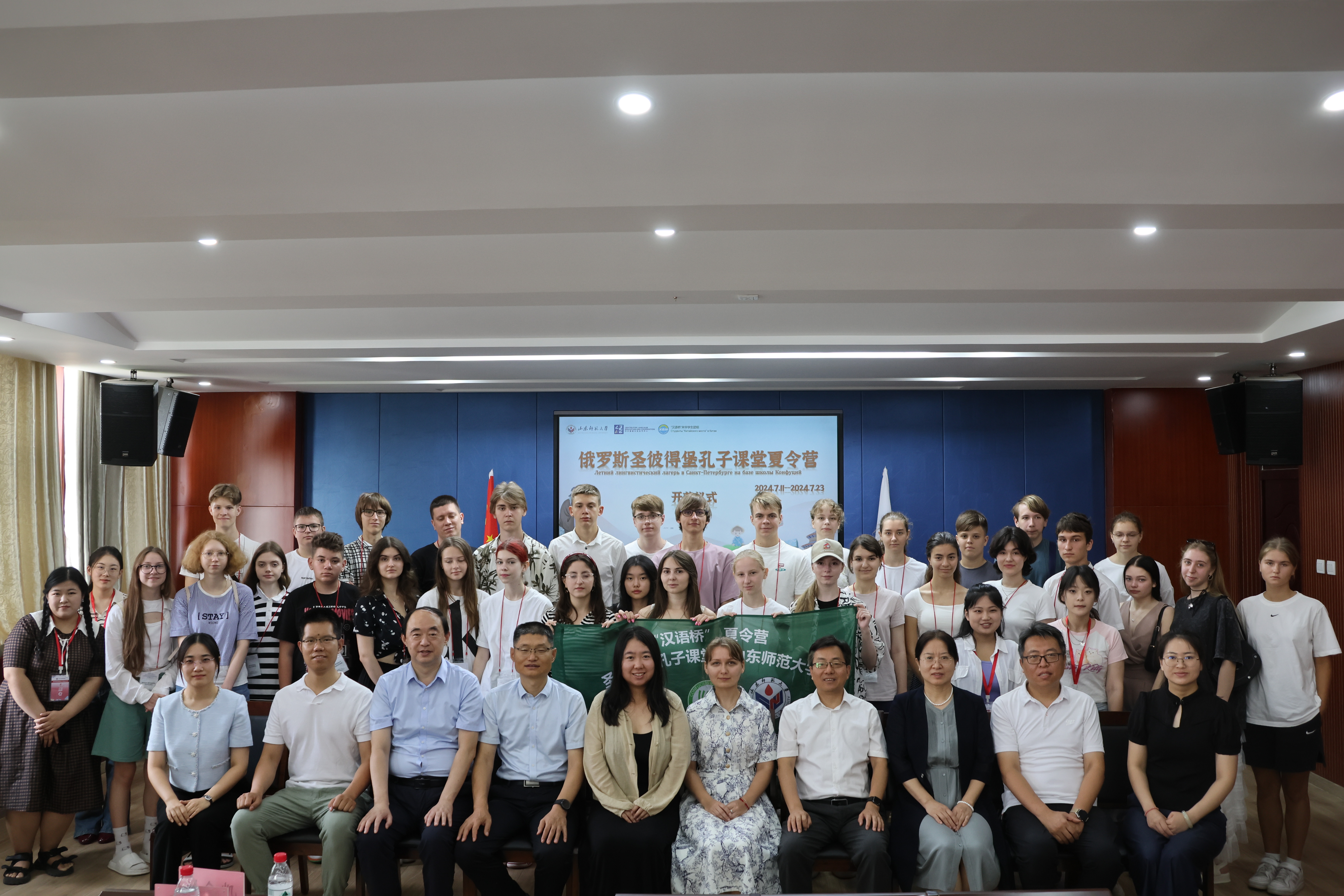 7月14日上午,由教育部中外语言交流合作中心主办,山东师范大学国际教育学院(留学生工作办公室)承办的2024年“汉语桥”来华团组交流项目——俄罗斯圣彼得堡“孔子”东方语言文化学院孔子课堂夏令营顺利开营。俄罗斯圣彼得堡“孔子”东方语言文化学院孔子课堂教务副院长马丽、教师娜斯佳、山东师范大学继续与培训学部副教授杨翠艳、国际教育学院党委书记刘金凯、院长马茂祥、留学生教育系主任常庆丰、留学生办公室副主任刘峰和夏令营全体师生、志愿者共同参加了开营仪式。仪式由刘金凯主持。
